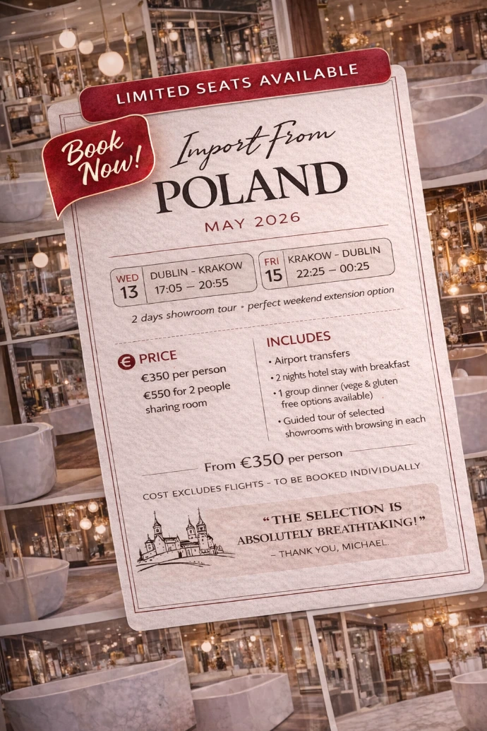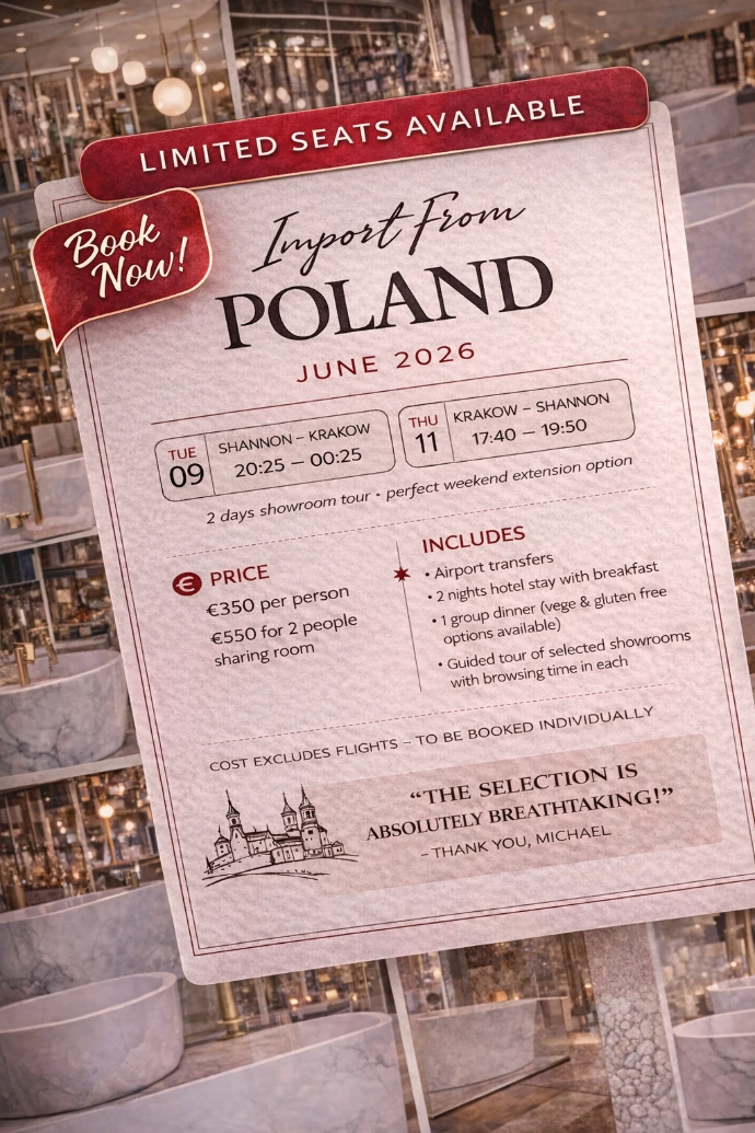 Experience 2 days in Poland discovering trusted suppliers and premium materials — guided by experts who’ve been exporting to Ireland for years.